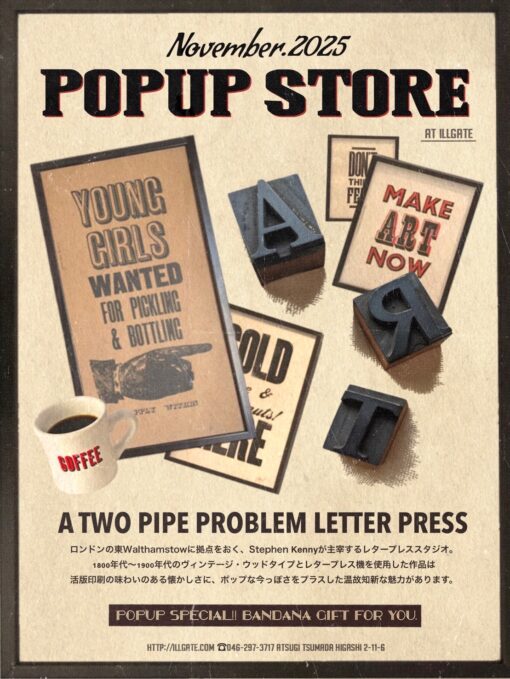 1800年代〜1900年代のヴィンテージ・ウッドタイプとレタープレス機を使用した作品は活版印刷の味わいある懐かしさに、ポップな今っぽさをプラスした温故知新な魅力があります。